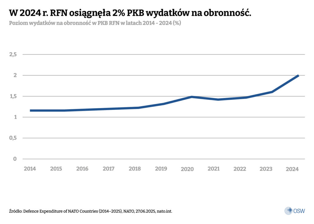 Same Niemcy są również dalekie od ograniczenia swojego potencjału obronnego, a kontrolę zbrojeń zastąpiły zbrojenia. Ustanowienie w lutym 2022 r. specjalnego funduszu dla Bundeswehry w wysokości 100 mld euro umożliwiło wzrost wydatków na obronność z 52,4 mld do 90,6 mld euro w 2024 r. Tym samym RFN po raz pierwszy od 1990 r. przekroczyła poziom 2% PKB (2,1%) nakładów na obronność. Rząd Friedricha Merza planuje ich dalsze zwiększanie dzięki wyłączeniu finansowania wydatków na szeroko pojętą obronność przekraczających 1% PKB z obszaru działania hamulca długu (zob. hasło Schuldenbremse) w kwietniu 2025 r. (LG)