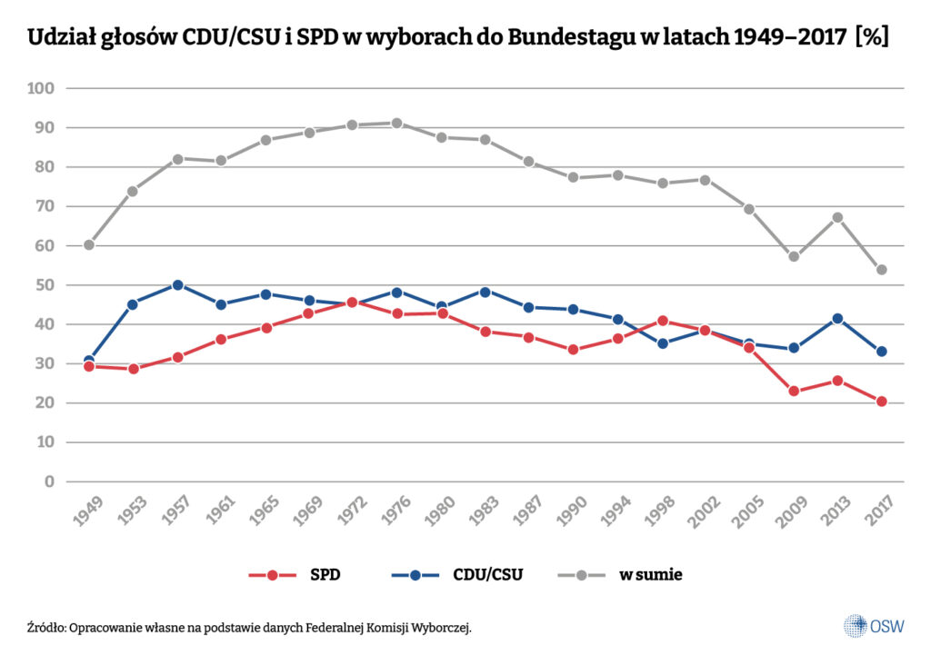 W OSW stale śledzimy ewolucję niemieckiej sceny politycznej. Prekursorskim tekstem ukazującym skalę zmian jest komentarz Artura Ciechanowicza po wyborach do Bundestagu w 2017 r. – trafnie diagnozujący bezpowrotnie utraconą przewidywalność niemieckiej polityki (zob. Bezpowrotnie utracona przewidywalność: niemiecka scena partyjna po wyborach). Autor wskazywał na migracje elektoratu między partiami, osłabienie przywiązania wyborców do dawnych struktur oraz na szybsze rozliczanie przez nich polityków z obietnic wyborczych. To, co dotychczas scalało wielkie grupy społeczne (struktury związkowe, identyfikacje klasowe, więzy wyznaniowe), traciło na znaczeniu i ułatwiło przepływ elektoratu. Prawdziwym game changerem okazało się powstanie AfD w 2013 r. Wzmocnione polityką migracyjną kanclerz Merkel ugrupowanie trwale odebrało część elektoratu CDU/CSU oraz SPD i radykalnie przemodelowało niemiecką scenę polityczną. (KF)