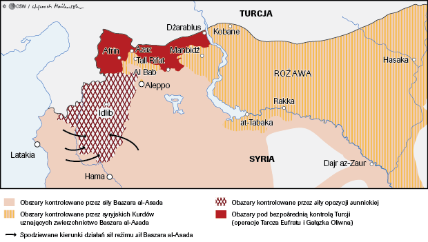 - Rozpoczęta 4 września ofensywa wojsk reżimu, wspieranych przez lotnictwo rosyjskie, siły irańskie oraz libański Hezbollah i syryjskich Kurdów ma na celu likwidację ostatniego bastionu sunnickiej opozycji syryjskiej. Znajduje się tam kilkadziesiąt tysięcy bojowników należących do różnych organizacji, spośród których największą jest ekstremistyczna koalicja Hajat Tahrir asz-Szam (dawniej Dżabhat an-Nusra, uznawana za organizację terrorystyczną w UE). Ludność Idlibu jest obecnie szacowana na ok. 3,5 mln ludzi, w tym ok. 1 mln przesiedleńców z innych prowincji. Idlib od początku konfliktu był mocnym bastionem opozycji, zaś w ostatnich latach miejscem, do którego ewakuowani byli bojownicy z rodzinami z obszarów zdobywanych przez siły rządowe. Zdobycie Idlibu przez siły reżimu oraz ich sprzymierzeńców oznaczałoby ostateczne zwycięstwo Baszara al-Asada. Ponadto doprowadziłoby to do powtórzenia scenariusza znanego z dotychczasowych działań sił reżimu m.in. w Aleppo, gdzie dochodziło do stymulowanego exodusu ludności cywilnej (gł. do Idlibu, i dalej do UE). Upadek Idlibu spowoduje więc katastrofę humanitarną i masowy napływ uchodźców do Turcji (odnotowano już pierwsze ruchy ludności w stronę granicy tureckiej).