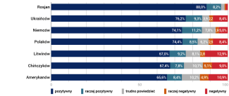 Najniższy poziom skojarzeń pejoratywnych („zdrajcy”, „nieprzyjaźni”, „bezczelni”, „skąpi” itp.) odnotowano wobec Polski – wyniósł on 6,6%. W przypadku Ukrainy skumulowane wskazania o charakterze negatywnym stanowiły 15,2% wszystkich, co należy uznać za poziom umiarkowany przy uwzględnieniu, że kraj ten jest stałym celem propagandy białoruskiej i rosyjskiej. Oceny negatywne wobec UE i Litwy stanowiły odpowiednio 12,9% i 8,6%. Należy zarazem zaznaczyć, że w przypadku Rosji brak odpowiedzi zdarzał się znacznie rzadziej (19%) niż w przypadku Ukrainy (34%), Polski (38,2%), UE (42,7%) i Litwy (43,3%), co potwierdza, że Białorusini najlepiej znają Rosję. Odzwierciedlają to omawiane niżej badania dotyczące podróży zagranicznych mieszkańców Białorusi.