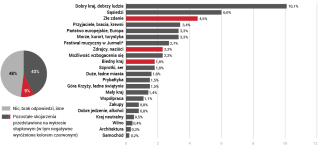 Jedyne pytanie otwarte w sondażu dotyczyło skojarzeń związanych z Polską, Rosją, Litwą, Ukrainą i UE. W odniesieniu do każdej nich znaczną większość konotacji można zakwalifikować jako pozytywne. Najwyższy odsetek wskazań o zabarwieniu negatywnym dotyczył Rosji („reżim dyktatorski”, „niski poziom życia”, „korupcja”, „agresja” itp.) i łącznie sięgnął 15,8%. Oznacza to, że niektórzy respondenci mieli negatywne pierwsze skojarzenie z Rosją, a mimo to deklarowali pozytywny lub raczej pozytywny stosunek do niej oraz do Rosjan. Jest to kolejny przykład wspomnianych wyżej sprzeczności w białoruskim pojmowaniu rzeczywistości.