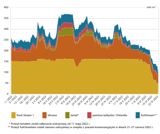 Wykres. Przesył rosyjskiego gazu do Europy w 2022 roku